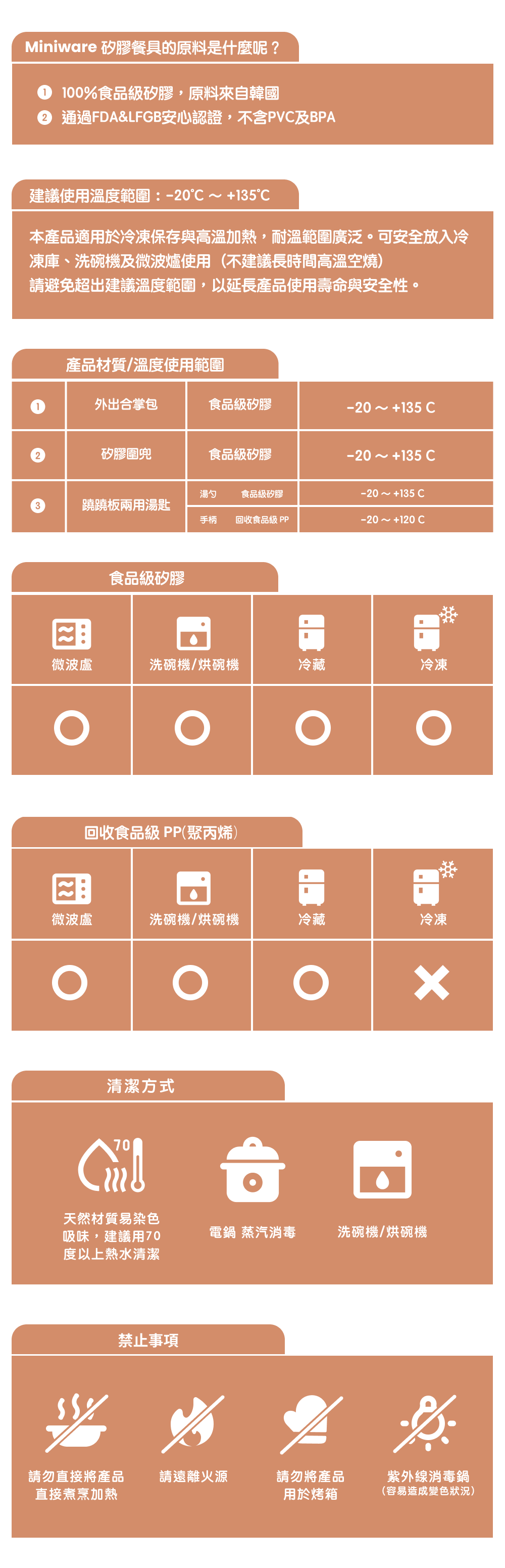 | 耐熱溫度 | 食品級矽膠 (建議使用溫度):-20 ~ +135度 / 回收食品級 PP: -20 ~ +120度 |