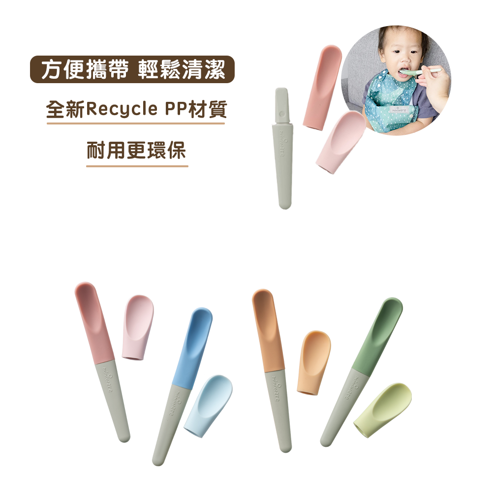 Miniware蹺蹺板兩用湯匙握柄,隨寶寶成長自由更換勺頭,滿足液態與固體副食品使用期。我們努力賦予育兒商品一個更長的使用周期,讓湯匙更多用途!