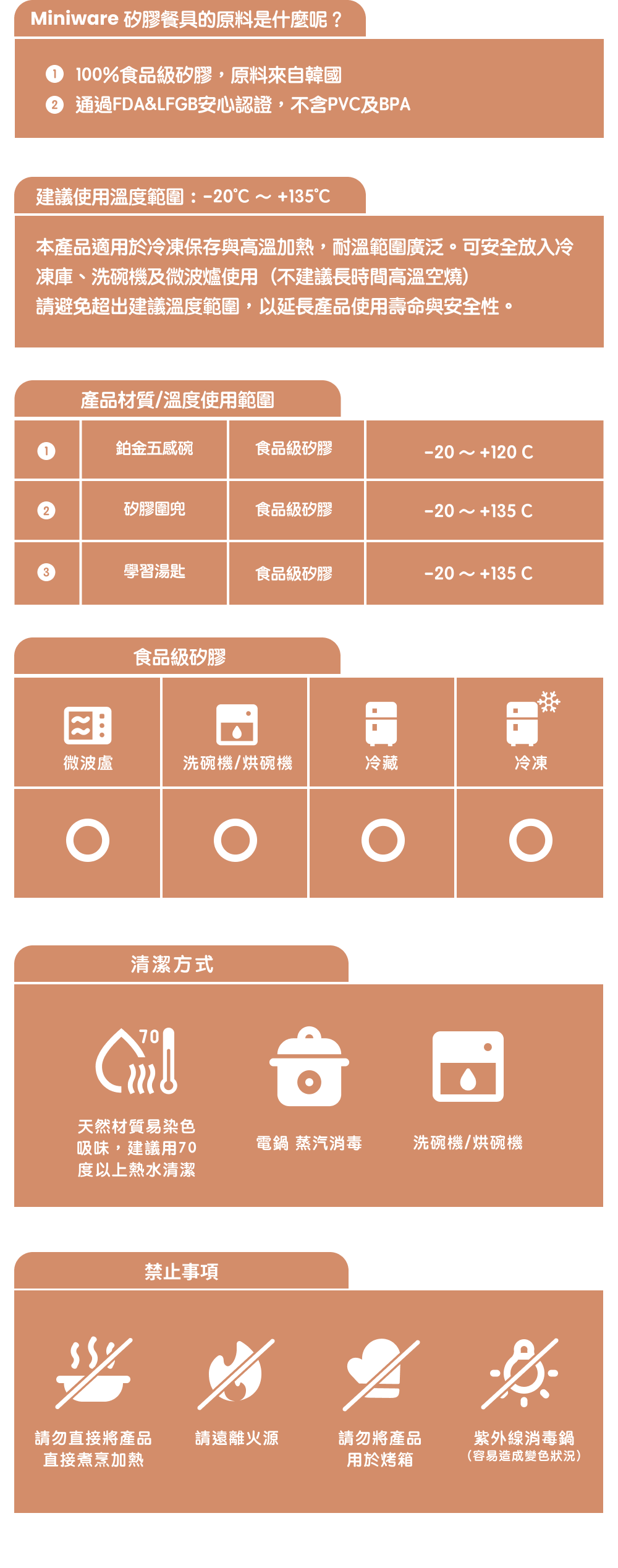 | 耐熱溫度 | 食品級矽膠(建議使用溫度):-40 ~ +135度 |
