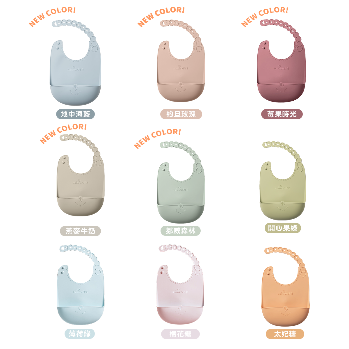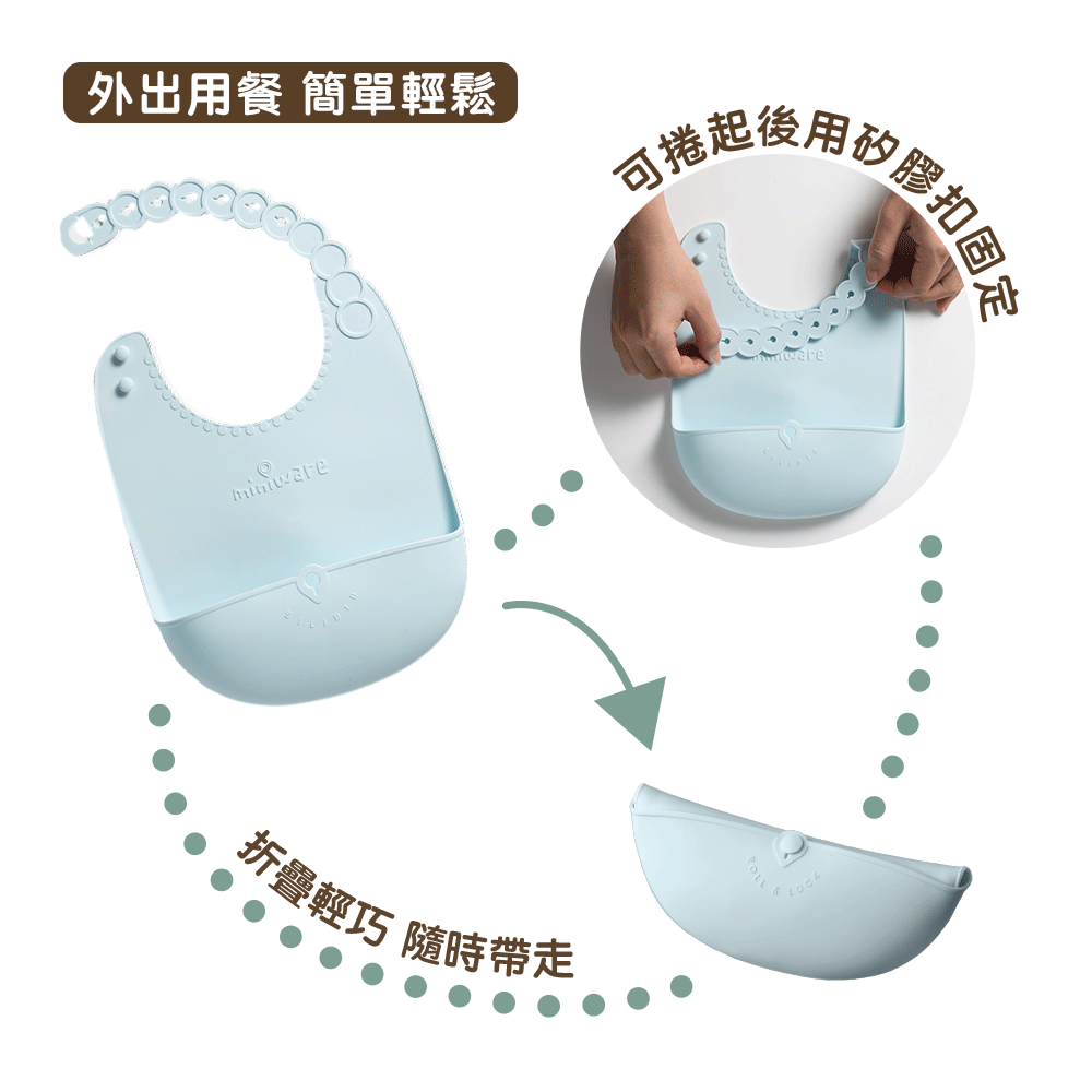 Miniware入門必備款,可捲扣式矽膠圍兜,出門在外好收納,立體防水,一件式好清洗,不易孳生黴菌,榮登最不佔空間的外出餐具用品。