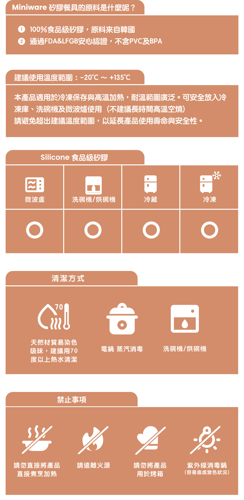 | 耐熱溫度 | 食品級矽膠 (建議使用溫度):-20 ~ +135度 |